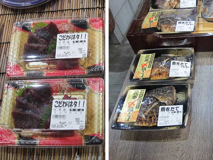 朝一番に仕入れた魚を捌いたお造りは絶品ですよ。タイやブリはもちろん、珍しいクジラも。 そんな魚を使った巻き寿司や海鮮丼もお勧めです。 また、氷見漁港から仕入れた干物も絶品です。 「火曜日は売り尽くし」で午後5時以降はお造り・丼物20%オフや「日曜日はお刺身DAY」で10%オフなど、サービスデーもありますので是非一度覗いてみてください。 |